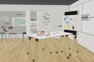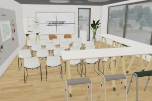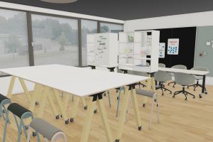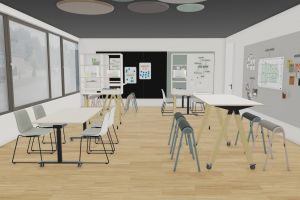 Skizze eines Raumes mit Draufblick. An zwei Wänden Möglichkeiten zum Anpinnen. Links an der Wand Videowand mit vier Bildschirmen. Mittig Holzboden mit L-förmigem Tisch und Hockern sowie Konferenzbestuhlung und zwei weiteren Büroelementen im Raum.