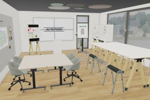 Skizze eines agilen Raumes von oben. Verschiedene Agile Möbelstücke auf Holzboden. Zwei große Tische nebeneinander angeordnet mit Stühlen und Hockern. Zwei Wände mit Elementen zum pinnen und beschreiben. An der dritten Wand großer Bildschirm.